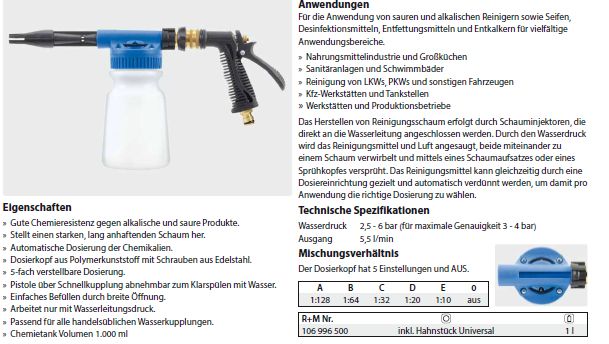 Das Herstellen von Reinigungsschaum erfolgt durch Schauminjektoren, die direkt an die Wasserleitung angeschlossen werden. Durch den Wasserdruck wird das Reinigungsmittel und Luft angesaugt, beide miteinander zu einem Schaum verwirbelt und mittels eines Schaumaufsatzes oder eines Sprühkopfes versprüht. Das Reinigungsmittel kann gleichzeitig durch eine Dosiereinrichtung gezielt und automatisch verdünnt werden, um damit pro Anwendung die richtige Dosierung zu wählen.